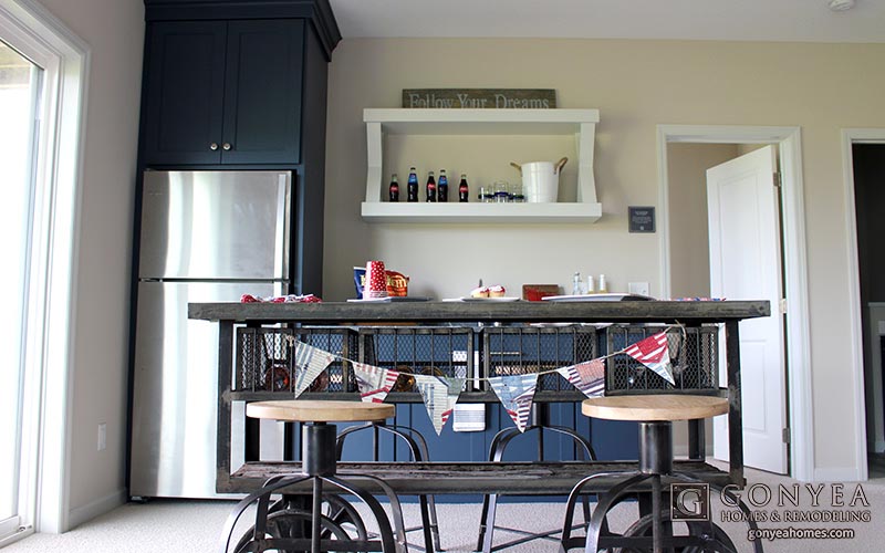 The walk-out lower level is equipped with a full bar and plenty of space for family and friends. This custom-built bar fuses the contemporary farmhouse design of the kitchen (see Part 1), with subtle one-of-a-kind details, like the custom-built “X” shelving unit above the sink, and the granite countertops. Much like the rest of the home, this space is flexible and ready for your unique touch. All we had to do was add a few Americana decorations, and this bar was ready for a patriotic celebration.