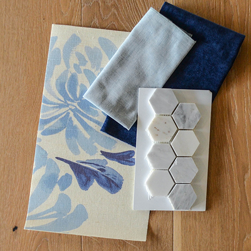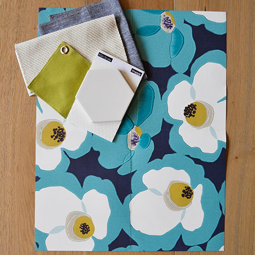 This combination brings a playful pop of color to your home. The crisp, bright white flowers and tile are surrounded by wonderful blues and greens, adding a fun lightness to the room.
