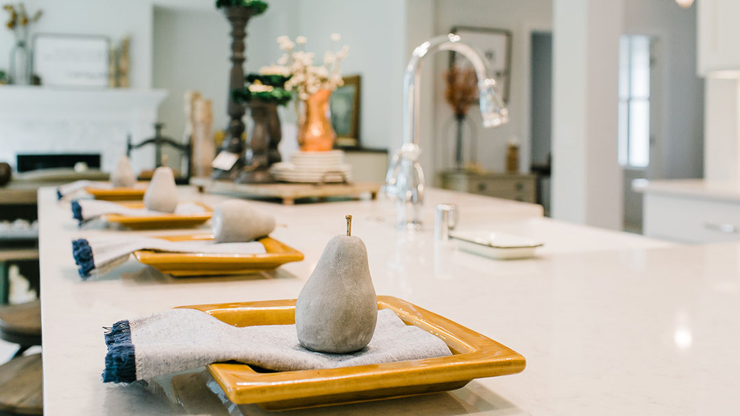 Don’t forget the island! You can decorate every space in your home by adding simple, yet unique and cohesive pieces. The centerpiece pillars add varying height, making it an interesting focal point for the eye.