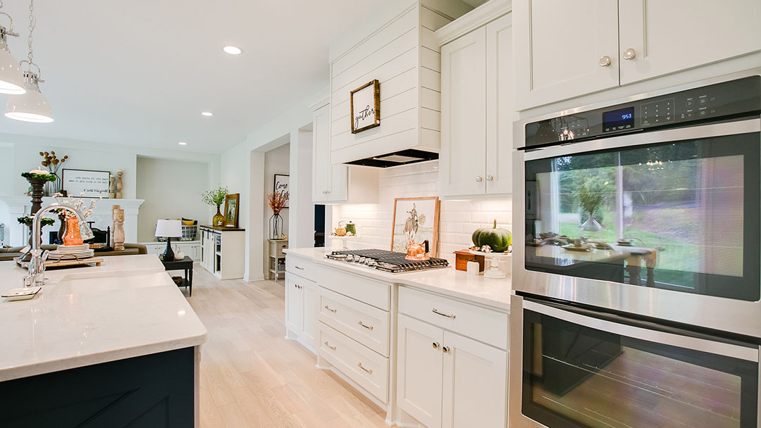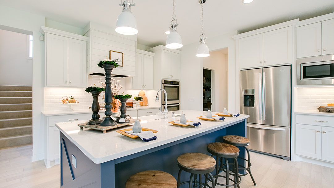Custom-built white cabinets, gorgeous beveled tile backsplash, and a navy island provide a fantastic blank canvas for this chef-inspired kitchen. With the shiplap hood and thought-out fall decor, this home is transformed into a warm contemporary farmhouse. We can just smell a pumpkin pie baking in the oven!