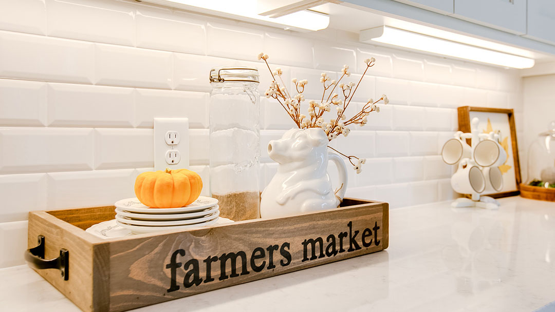 This “farmers market” wood tray is a cool and simple piece to incorporate into your kitchen. It gives the warmth and rustic feel of fall, while providing depth to a bright kitchen. Other wood pieces, and added pumpkin orange details bring pops of color throughout.