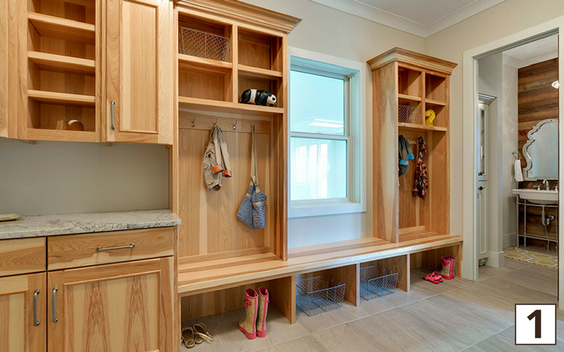 2. Take a seat on the custom bench, hang your coat on the paneled back wall, throw your keys on the granite counter, and don’t worry if you made a muddy mess! The tile makes for easy clean-up.