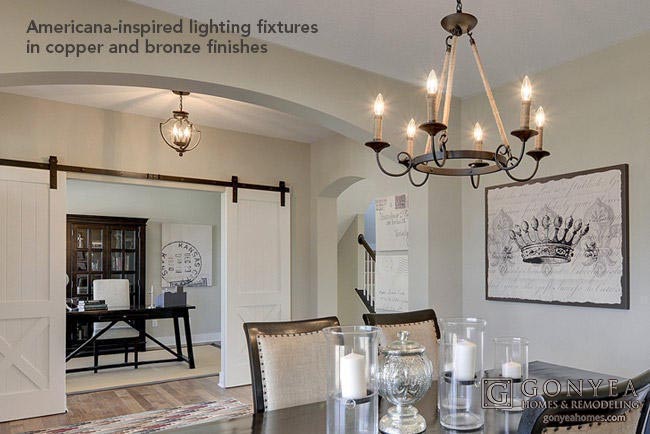 Priced at $719,900 this home hits a sweet spot of livability, durability, spaciousness, and sophisticated design. Traditional, classic elements are accented with rustic touches, like the barn doors for the home office, and the six light chandelier in dark bronze.