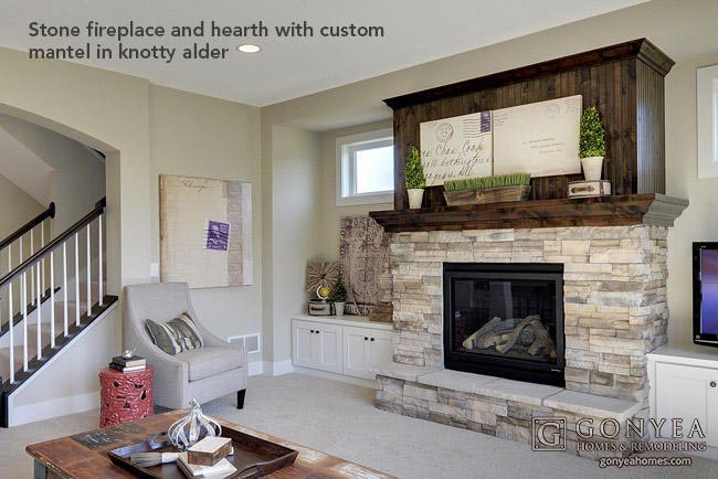 The fireplace and multi-stone hearth is wrapped in Savannah Ledgestone and topped with custom mantle in knotty alder. Above, the coffee colored, beadboard panel with crown moulding, creates a focal point for artwork or decorative objects.