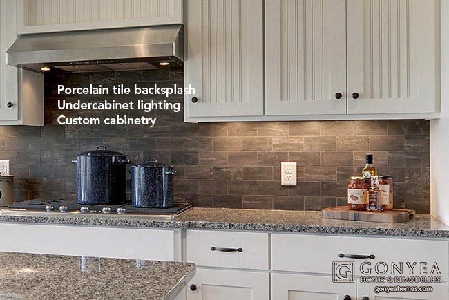 In the kitchen, harmonious variations in color and texture are the result of mixing bead board, stainless steel, bronze hardware, granite and porcelain tile. Under cabinet lighting reveals the subtle color variations in the stone-inspired backsplash. The tile has 21% recycled content and no VOC.