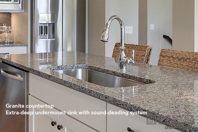 The center island features an extra-deep, stainless steel sink with sound deadening system and gooseneck Moen faucet. Perfect for washing oversized cutting boards or gigantic soup pots.