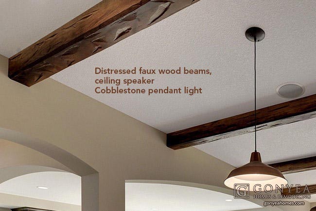 Look up. Instead of the usual flat ceiling and square corners, you’ll see distressed faux wood beams and graceful arches. Ceiling speakers are located in the great room, kitchen, master bedroom and of course the family room for surround sound.