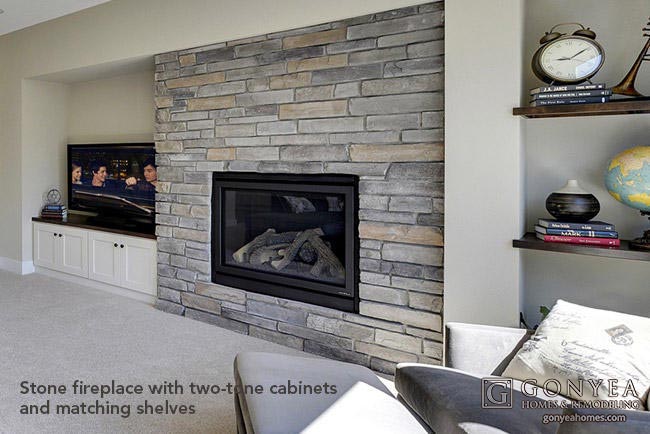Cabinet tops and shelves with coffee stain complement the light dusk carpet and horizontal lines of the ledgestone fireplace wall.