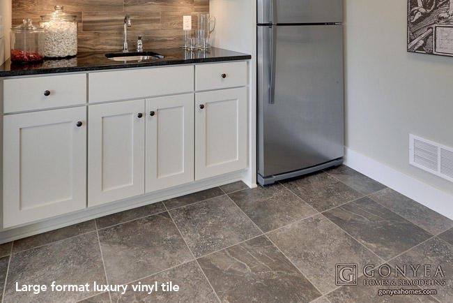 Large format LVT (luxury vinyl tile) is extremely durable. Installed with grout, it creates the rich look of stone at a modest price point.