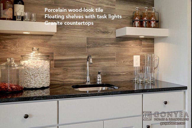 Above the black granite wet bar counter, floating white shelves look crisp and modern against the faux-wood porcelain tile.