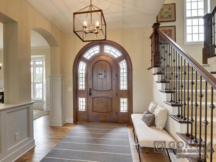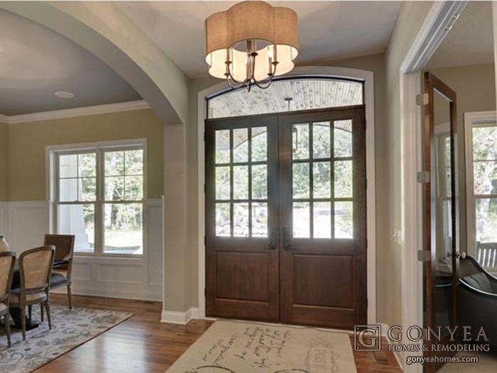 This entry emphasizes elegance; featuring an arched transom that echoes the architectural archway separating the formal dining room from the foyer, as well as an elegant chandelier.