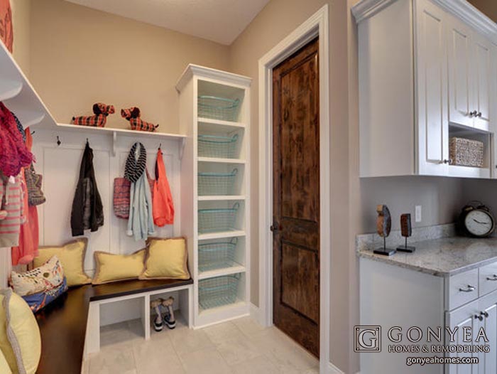 Moms and Dads alike agree– a mudroom eases the transition from out and about to inside the house. Each boot has a cubby, each coat its hook. Never lose your keys again– add a small cabinet and your keys will always find their place on the counter. A garage-door mudroom helps keep your family organized and your home spotless, especially during the wet and muddy Minnesota spring.