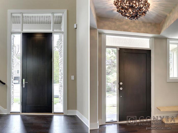 These homes inspired by the modern design movement make use of transoms and sidelights with bold proportions and feature the color palette of the rest of the home right away.
