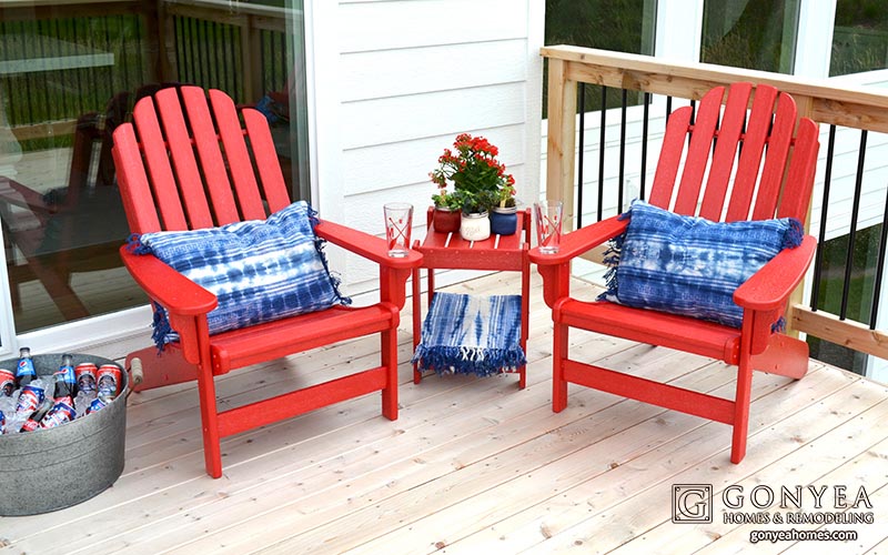 Through quality sliding doors right off the main level, this durable, custom-built cedar deck is essential to any home, making transitions from indoor to outdoor entertaining simple. The spacious design allows versatility for outdoor furniture and grilling. The upcoming holiday gave us an excuse to adorn the deck with red, white, and blue. The addition of Adirondack chairs, comfy pillows, and attractive plants illustrated how flexible this space could be throughout the changing holidays and seasons.