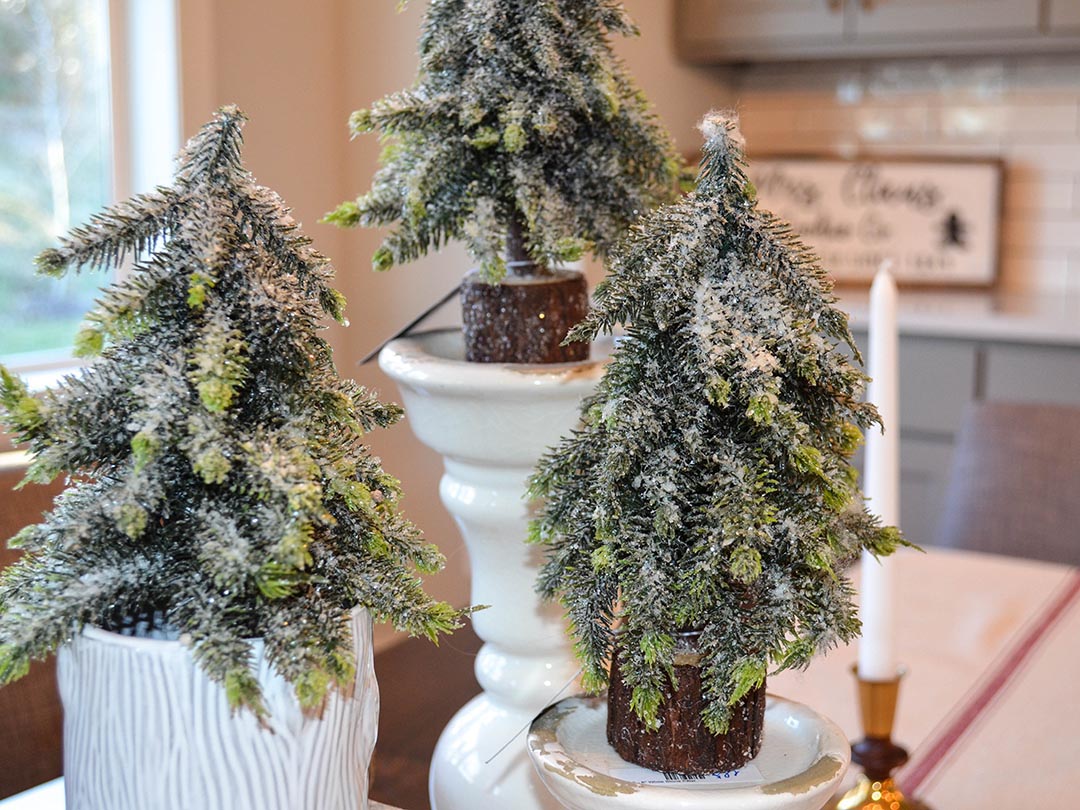 For the dinette table, we used a grain sack runner, playing to the farmhouse elements of the kitchen. The simple centerpiece included mini trees in varying heights, along with a candle on each side.