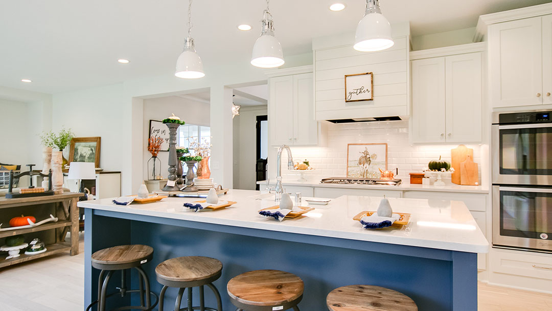 Custom-built white cabinets, gorgeous beveled tile backsplash, and a navy island provide a fantastic blank canvas for this chef-inspired kitchen. With the shiplap hood and thought-out fall decor, this home is transformed into a warm contemporary farmhouse. We can just smell a pumpkin pie baking in the oven!